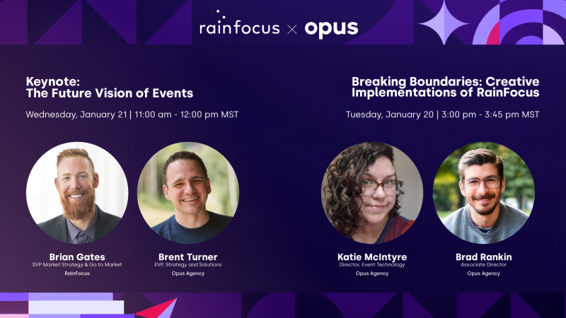 Join Opus Agency’s Brent Turner, Katie McIntyre, and Brad Rankin at RainFocus INSIGHT 2026 for two must-see sessions that explore the future vision of events and the creative realities shaping them today.